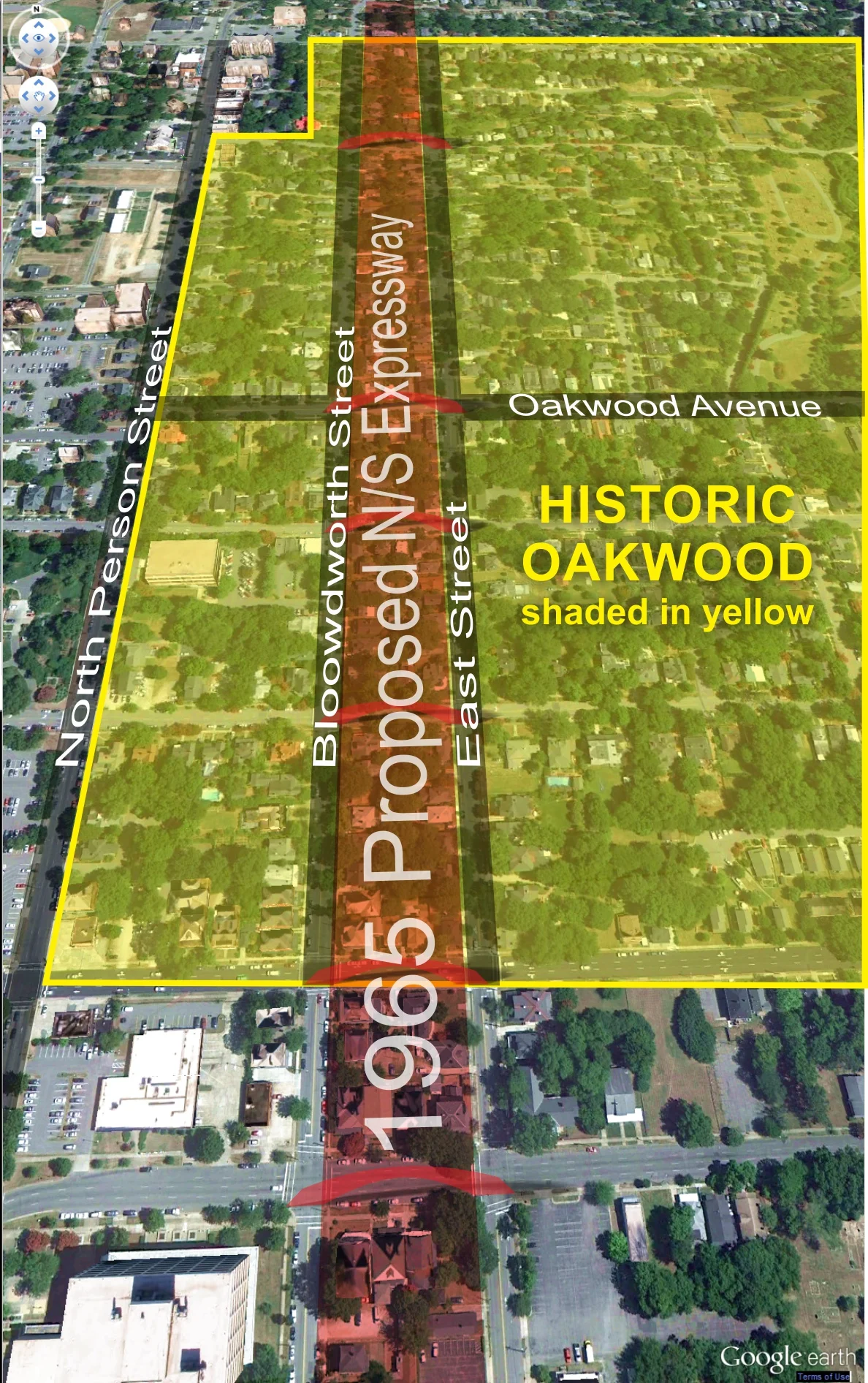 Here in Oakwood, the North-South Freeway loomed. The slated route connected Capital Boulevard (then known as Downtown Boulevard) with what would become Martin Luther King Jr. Blvd. and, farther south, with U.S. 401. For its length downtown, the freeway would cut through Oakwood and Chavis Heights between Bloodworth and East Streets in a sunken, below-grade thoroughfare.